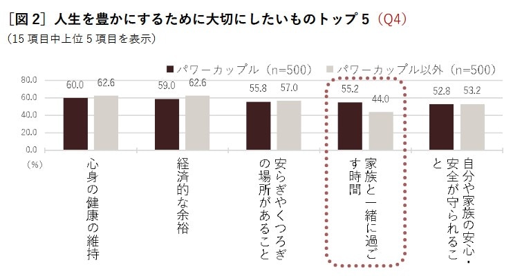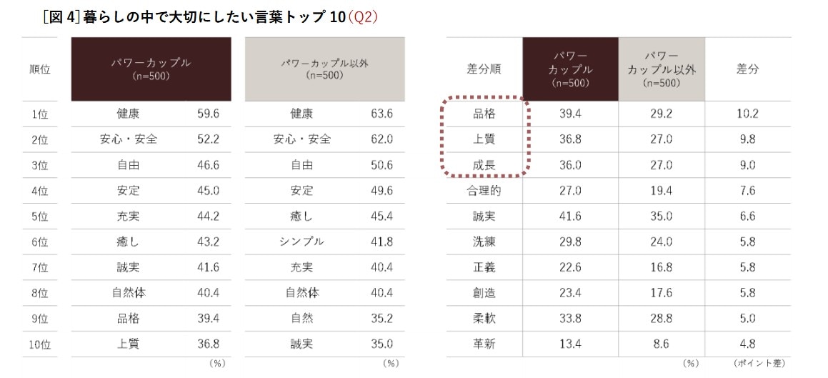 アンケートでは「人生を豊かにするために大切にしたいもの」や「暮らしの中で大切にしたい言葉」を質問しており、パワーカップルほど大切にする傾向の強いものとして「家族と一緒に過ごす時間」や「品格」「上質」といった言葉が挙げられています。
