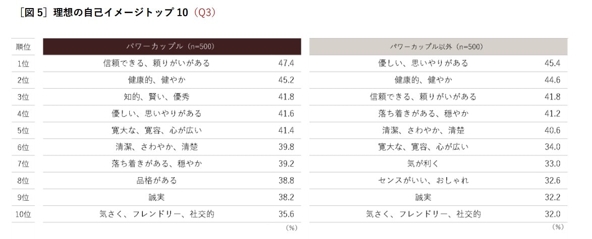 この調査では「理想の自己イメージ」を聞いていることも興味深いポイントです。パワーカップルでは「信頼できる、頼りがいがある」「知的、賢い、優秀」の選択肢を選んだ回答者が多く、自身がビジネスパーソンとして優秀であること、また周りからそう思われることを重視する人が多いと考えられます。