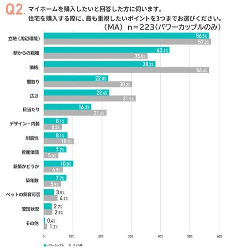 (出典:グローバルベイス(株)『【パワーカップルの住まい選びに関する調査】住宅購入時に重視するポイントは「立地」・「駅距離」。』)