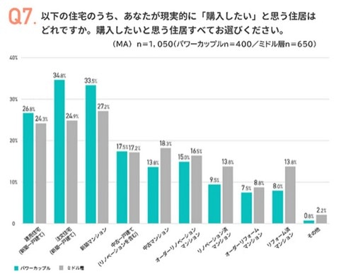 なおこの調査では、パワーカップルと定義されている回答者のうち3割以上が注文住宅の購入意向があると回答しており、比較対象である「ミドル層」(世帯年収600~1,000万円)のなかで注文住宅の購入意向があると回答した人の割合を大きく上回っていることも注目に値するポイントです。