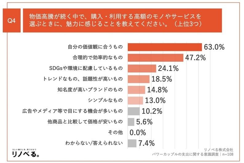 リノベる(株)が2024年8月に行った調査では、パワーカップルの支出に対する意識や現在の住居への不満を聞かれています。回答によると、パワーカップルでは高額な商材に支出をする際に「自分の価値観に合うもの」「合理的で効率的なもの」「SDGsや環境に配慮しているもの」であることを重視する人が多いことが示されています。