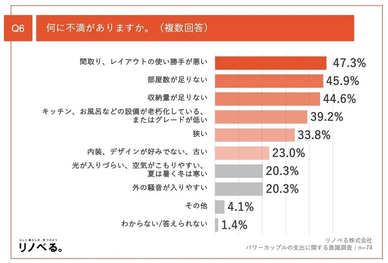 現在の住居への不満では「間取り、レイアウトの使い勝手が悪い」「部屋数が足りない」「収納量が足りない」を選んだ回答者が多く、やはりパワーカップルは住まいに機能性、合理性を求める傾向が強いといえるでしょう。