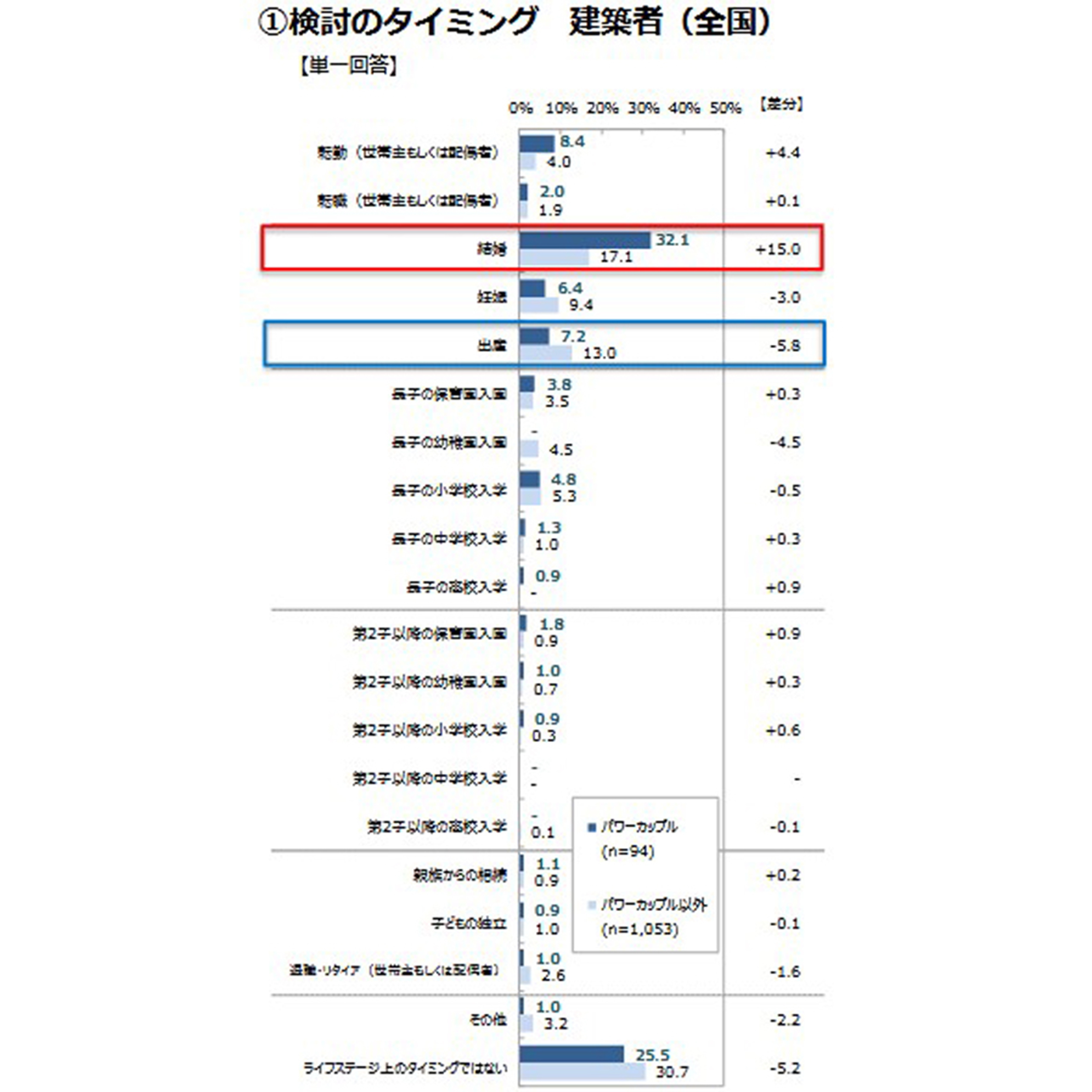 注文住宅を検討した時期を尋ねる設問では、パワーカップルでは結婚を機に検討した人が多く、出産を機に検討した人は比較的少ないことが示されています。パワーカップル以外の人と比べて、ライフステージのより早い段階からマイホームの検討を始める傾向があるようです。