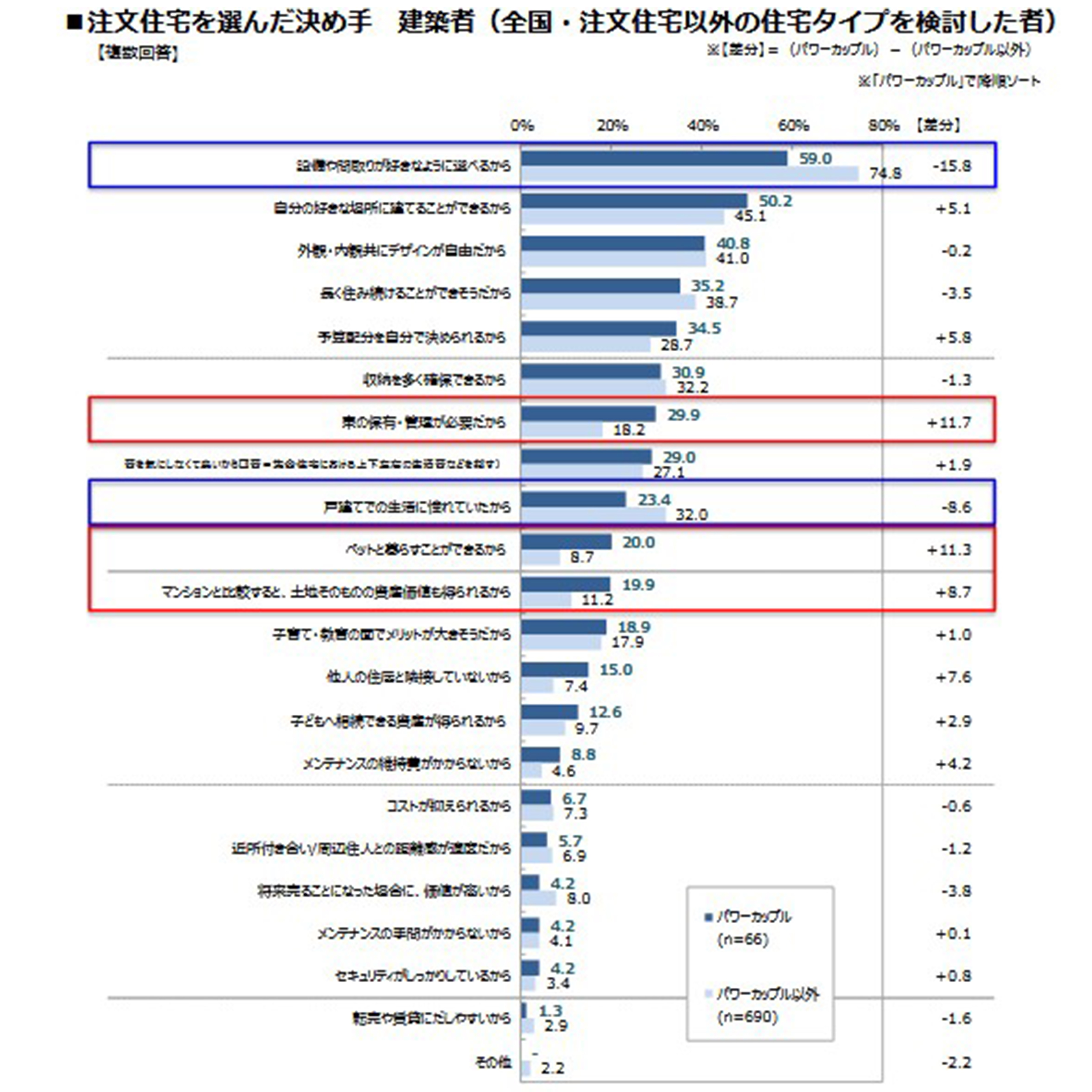 購入する住宅の種類として注文住宅を選んだ決め手も聞いており、パワーカップルの回答者数上位の項目には設備や間取り、立地、デザインの自由度が並んでいます。