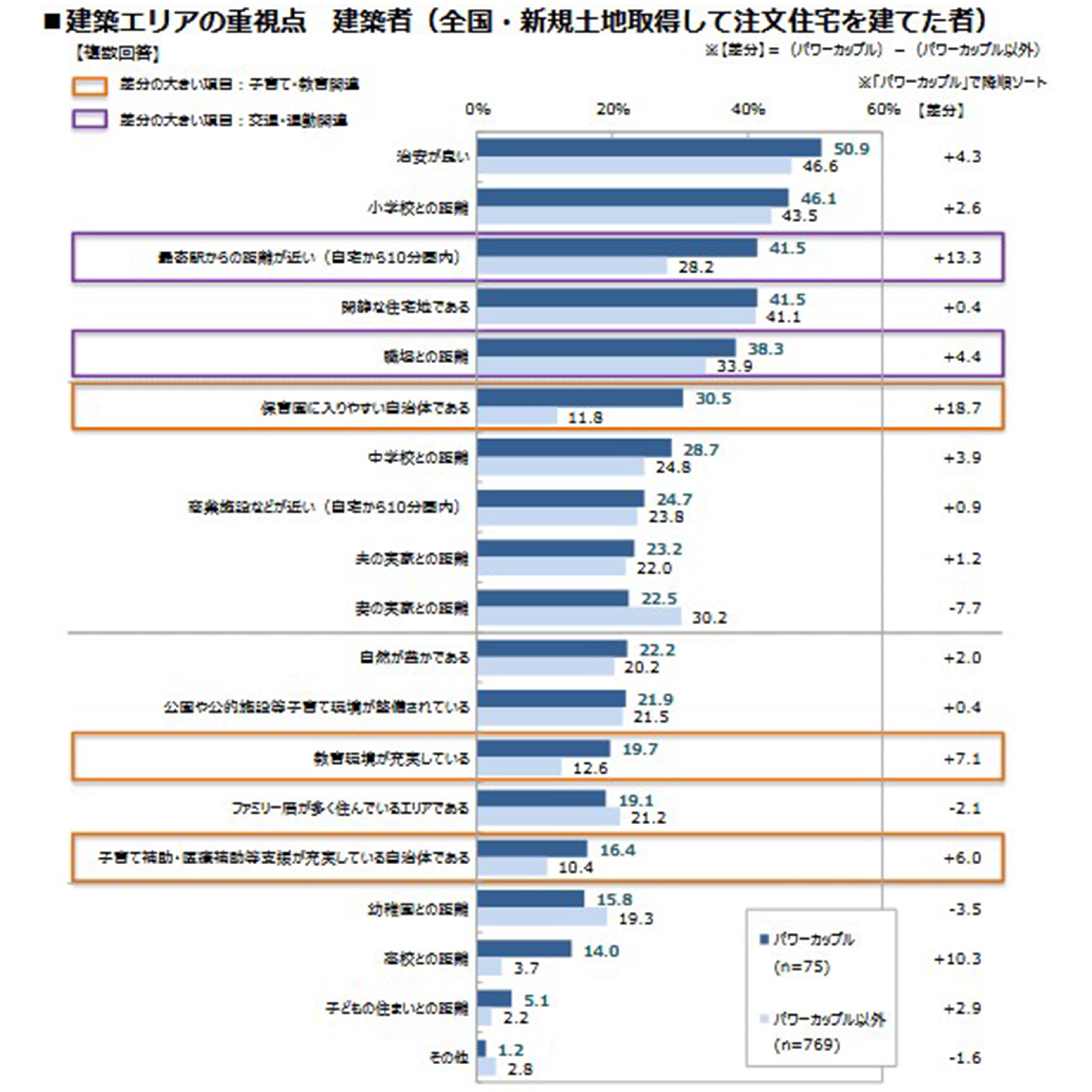 立地の重視ポイントも聞かれており、パワーカップルの回答者数上位項目には治安の良さ、小学校との距離、最寄駅からの距離が並ぶほか、パワーカップル以外の人と比べると自治体の保育園への入りやすさを選んだ回答者が特徴的に多くなっています。