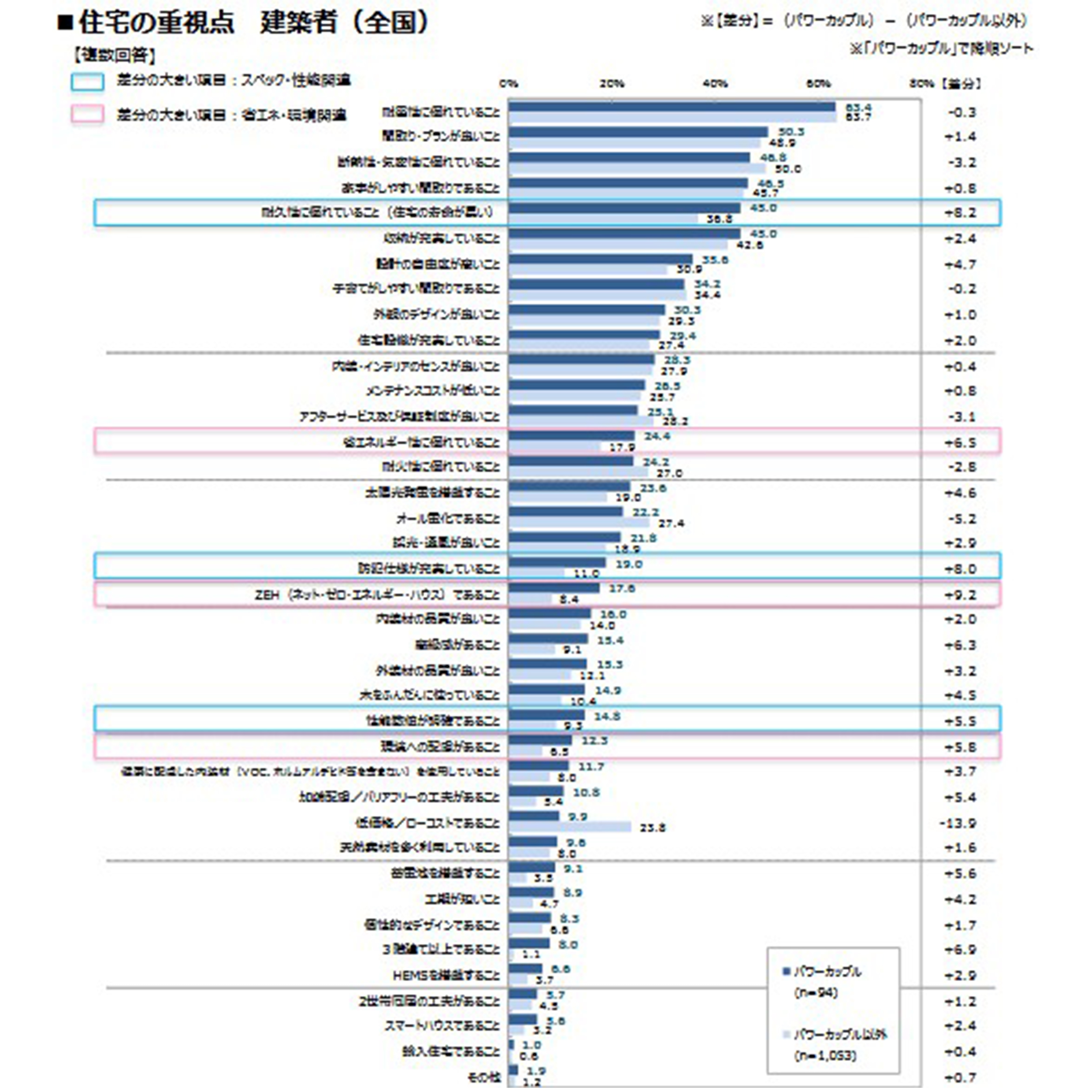 注文住宅の造りに関する重視ポイントでは、パワーカップルの回答者数上位項目には耐震性、間取り、断熱性・気密性が並んでいます。パワーカップル以外の人と比べると環境・省エネルギー性能に関する項目を選んだ回答者が特徴的に多く、入居後のランニングコストも考慮されやすい傾向があると考えられます。