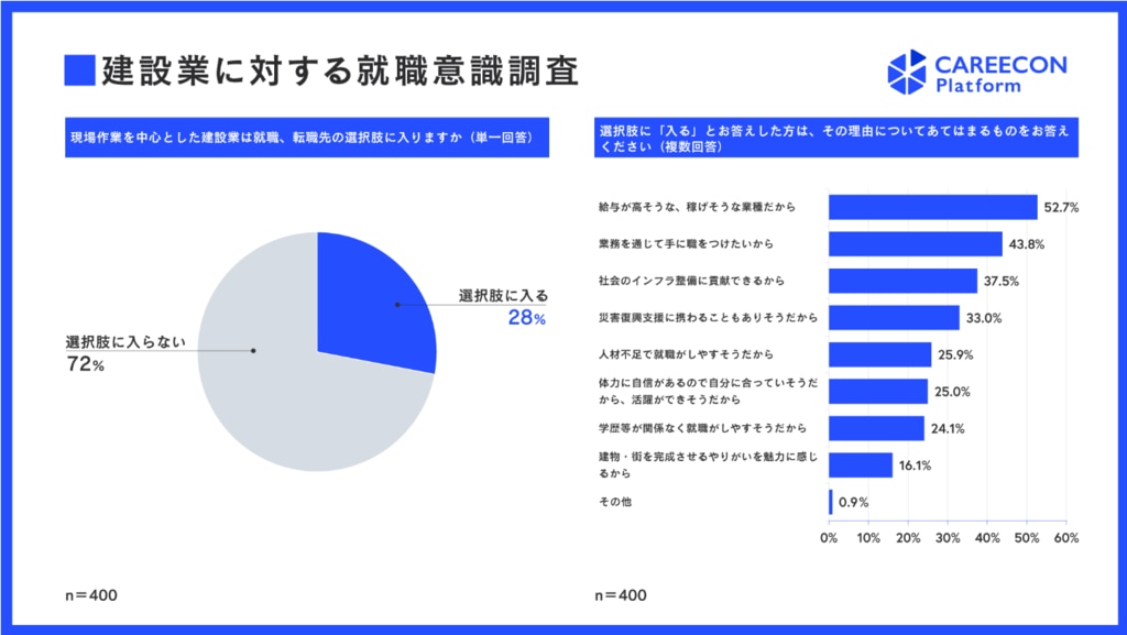 BRANU(株)が2024年に18歳~39歳の若年層に対して行ったアンケート調査では、回答者400人のうち28%は建設業が就職・転職先の選択肢に入ると答えています。これはつまり、若者世代の4人に1人はアプローチ方法次第で建設業への就業を選びうるということです。