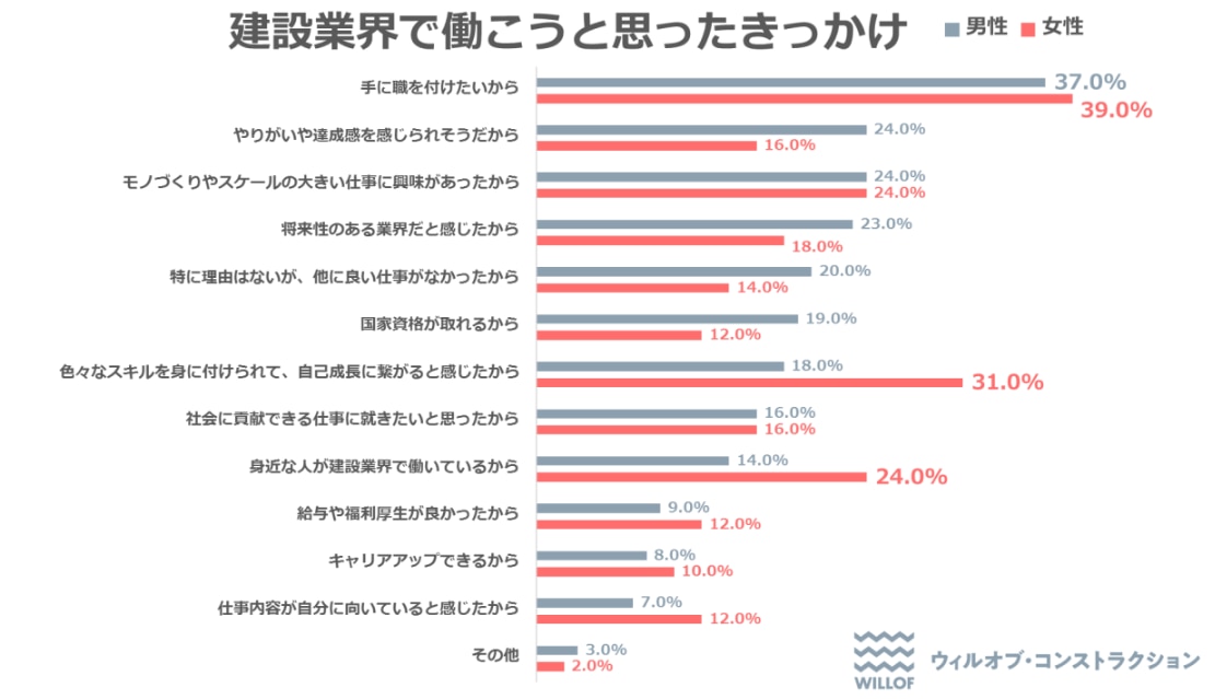 このなかで「建設業界で働きたいと思ったきっかけ」が男女別に集計されており、男女とも「手に職をつけたいから」と答えた回答者が最多となっていました。女性では「いろいろなスキルを身に付けられて、自己成長につながると感じたから」との回答も2番目に多くなっています。