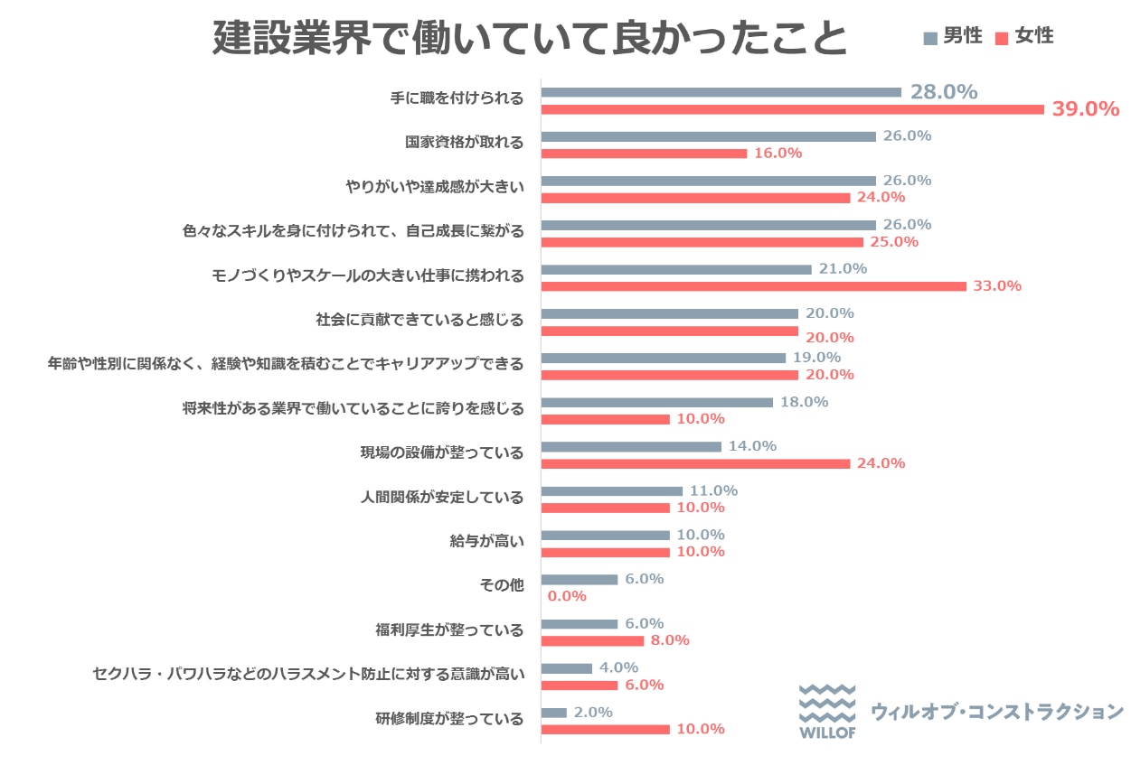 また「建設業界で働いていて良かったこと」の集計でも、男女とも「手に職をつけられる」と答えた回答者が最多でした。関連して「いろいろなスキルを身に付けられて、自己成長につながる」との回答も、男性で26.0%、女性で25.0%とそれぞれの4分の1に上っています。