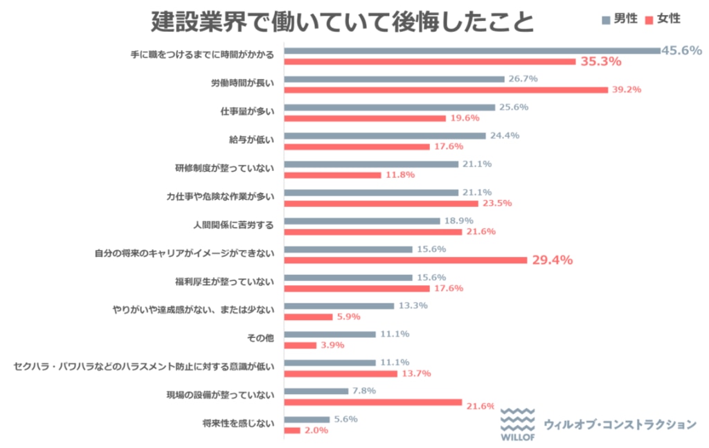 (株)ウィルオブ・コンストラクションの調査では「建設業界で働いていて後悔したこと」も尋ねています。このうち「手に職をつけるまでに時間がかかる」と答えた回答者は男性で半数近く(45.6%)、女性でも3分の1超(35.3%)に上っており、建設業界への就業に際して期待が大きい半面、不満の要因にもなりやすいことがうかがえます。