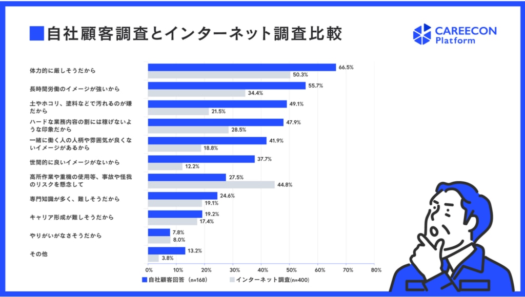 「現場作業を中心とした建設業が転職・就職の選択肢に入らない理由」について若年層の調査対象者とBRANU(株)の顧客である建設事業者の双方に尋ねており、このうち「高所作業や重機の使用等、事故やケガのリスクを懸念して」を選択肢に入らない理由として挙げた若者は回答者の44.8%に上りましたが、事業者側でこの項目を建設業が選ばれない理由になると予想していたのは27.5%のみでした。