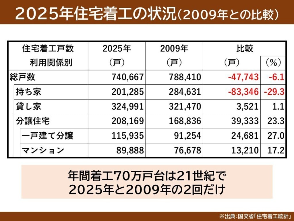 2025年は21世紀を迎えてちょうど四半世紀という節目の年でしたが、住宅着工戸数ベースでは21世紀が始まって最も少ない1年となりました。実数では、前年実績からマイナス6.5%となる74万667戸で着地しました。