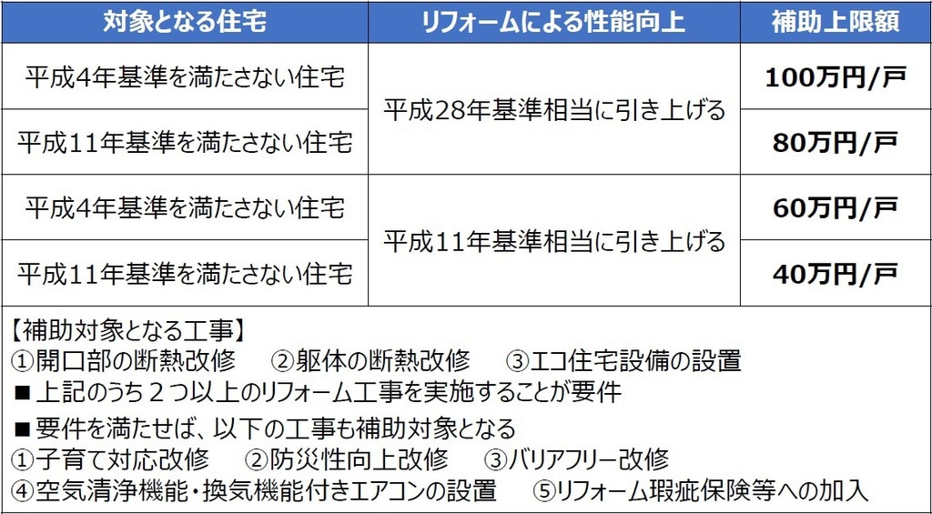 それぞれの住宅に対して省エネ工事を行い、どれだけ性能が向上したかに応じて補助上限額が変動し、平成4年基準(省エネ基準)に適合しない住宅の性能を平成28年基準まで引き上げると、1戸当たり最大100万円が補助されます。