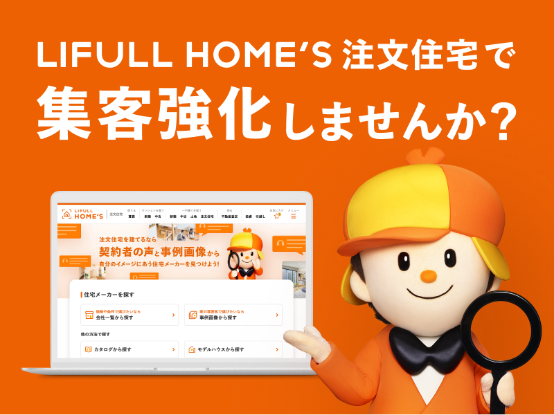 日本最大級の不動産・住宅情報サイト「LIFULL HOME'S」の注文住宅に特化したサービスです。パソコン、スマートフォン等で情報を探す注文住宅検討者に対し、工務店・ハウスメーカーの情報や魅力を効率よく告知することが可能です。