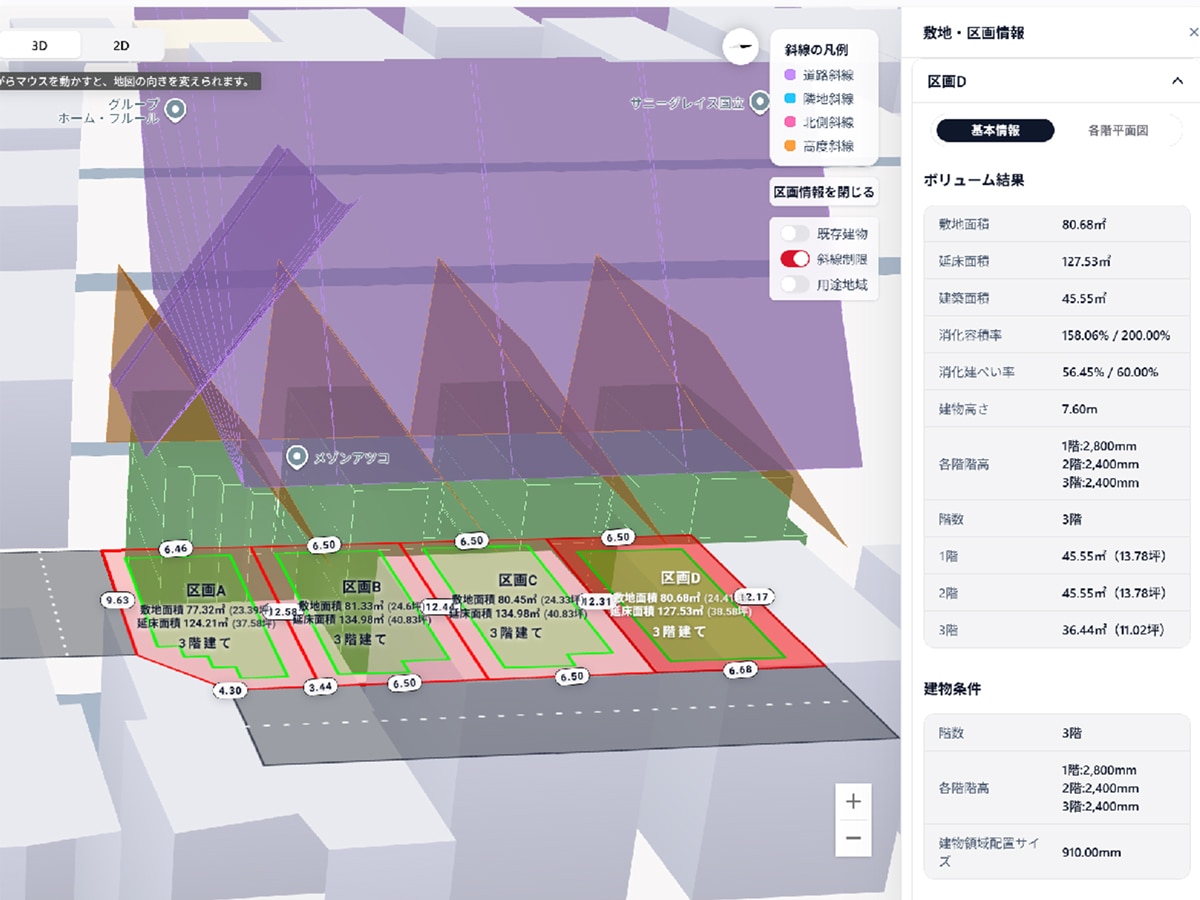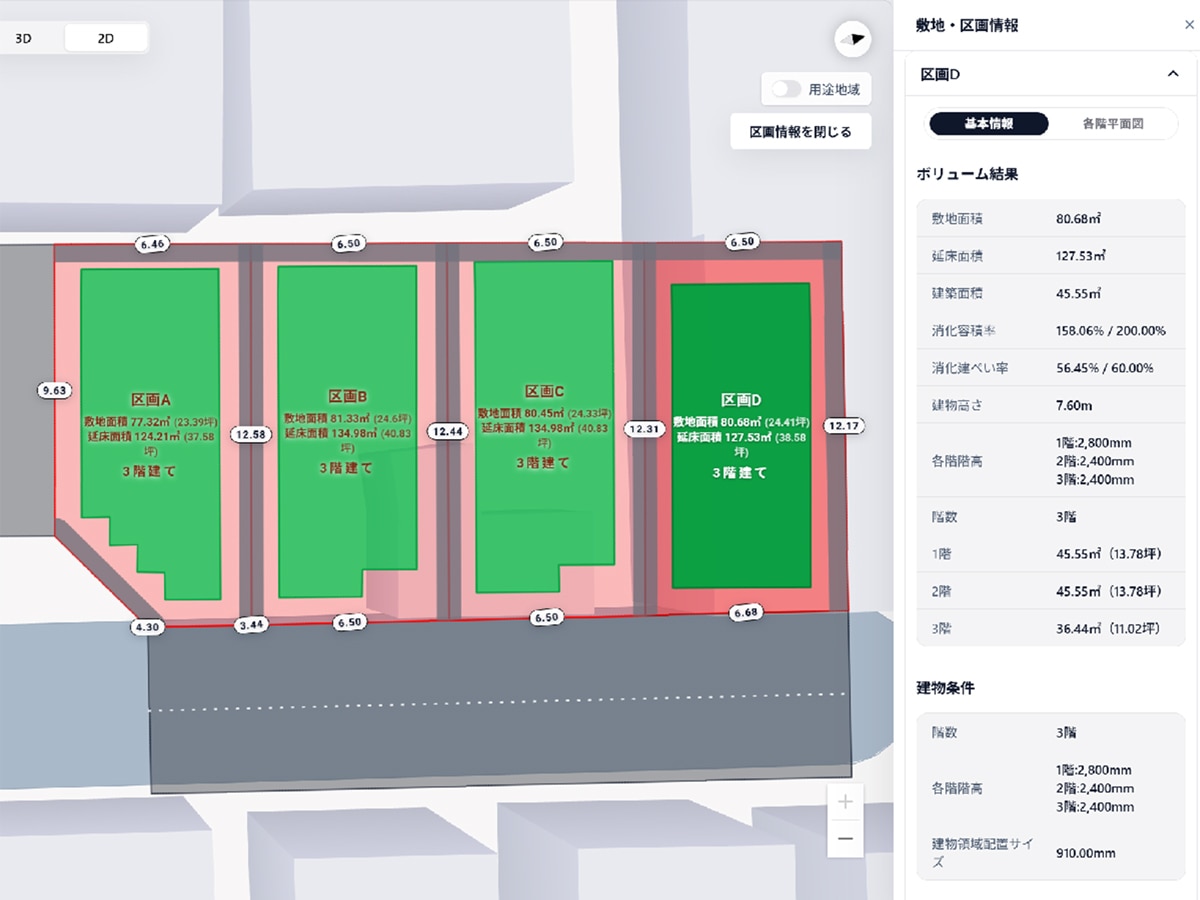 デベNAVI戸建は区画割をするだけで、全区画の3階成立可否や確保できる延床面積をまとめて検証。