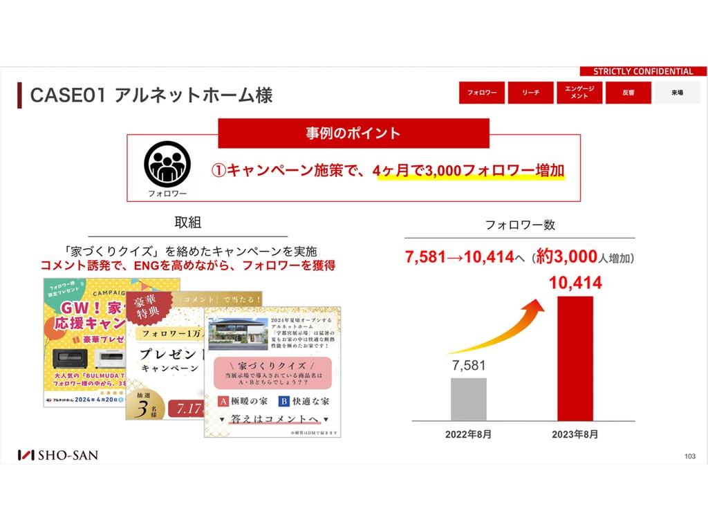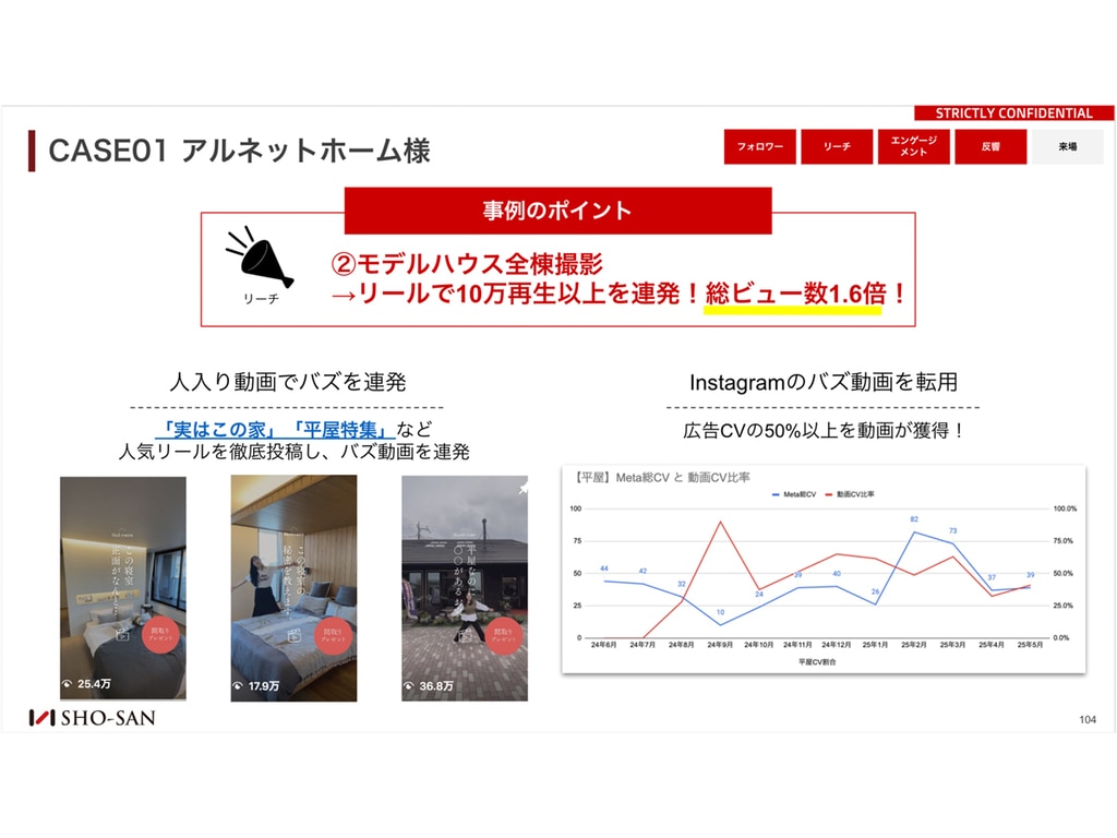 家づくりクイズを絡めたキャンペーン施策でコメント誘発とフォロワー獲得を同時に実現し、4ヶ月でフォロワーが7,581→10,414人へ約3,000人増加。さらにモデルハウス全棟撮影によるリール投稿では「実はこの家」「平屋特集」など人気企画で10万再生超を連発し、総ビュー数1.6倍を達成。