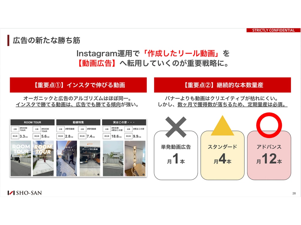 さらにInstagramで再生数が伸びたリール動画をMeta広告にそのまま転用(本数無制限・追加費用なし)。インスタで勝てる動画は広告でも勝てる傾向が強く、来場反響単価CPA1〜2万円台を実現した事例も多数。掛け捨て広告では実現できない「集客資産」が積み上がる運用です。
