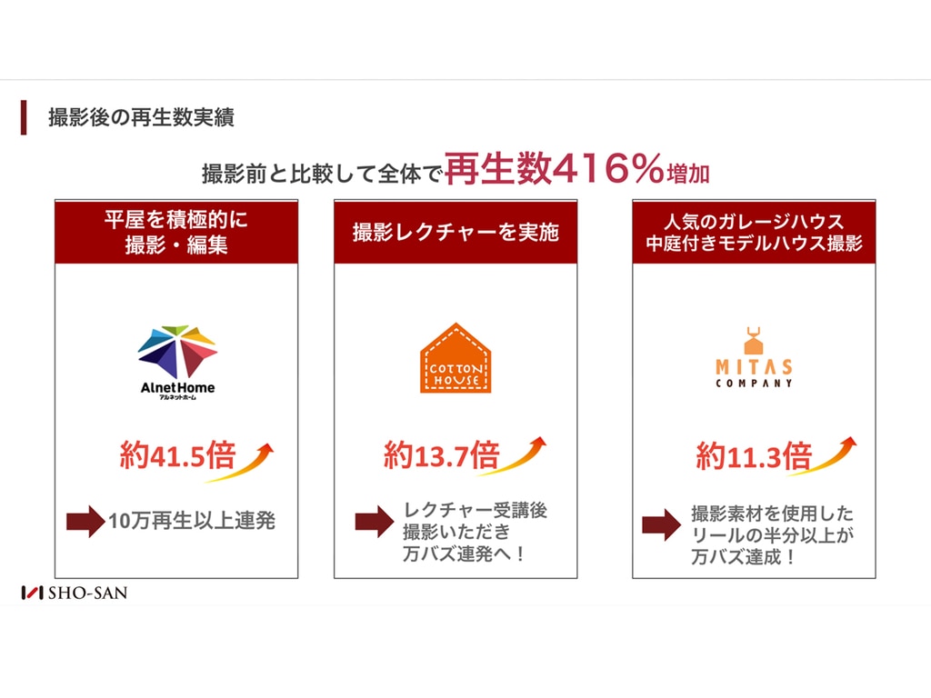 SHO-SANは年間5棟の地場工務店から大手ハウスメーカーまで、250社超を支援してきた住宅業界特化のInstagram運用会社です。